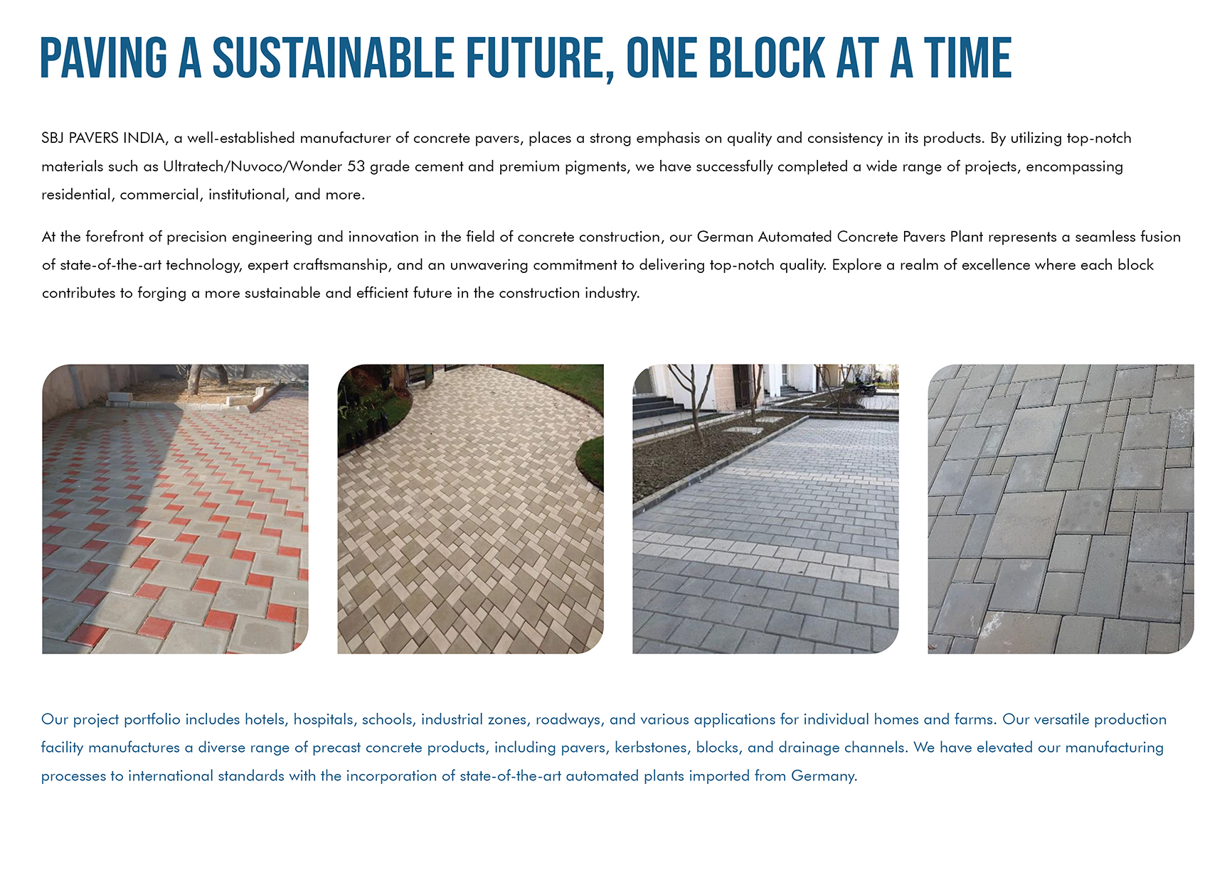 SBJ PAVERS, a division of SBJ Concrete, specializes in crafting premium-quality concrete pavers for modern construction and landscaping needs. With advanced manufacturing practices and strict quality control, we deliver pavers that are durable, stylish, and sustainable — perfect for driveways, pathways, parking areas, and large-scale projects.